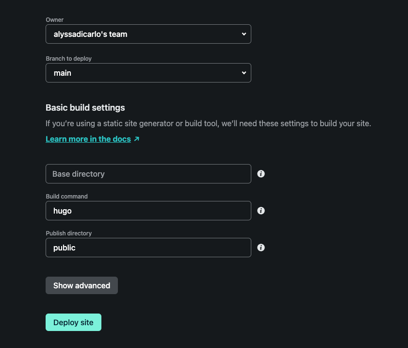 It will automatically populate all of the fields as shown below, and then you will need to click “deploy site”.