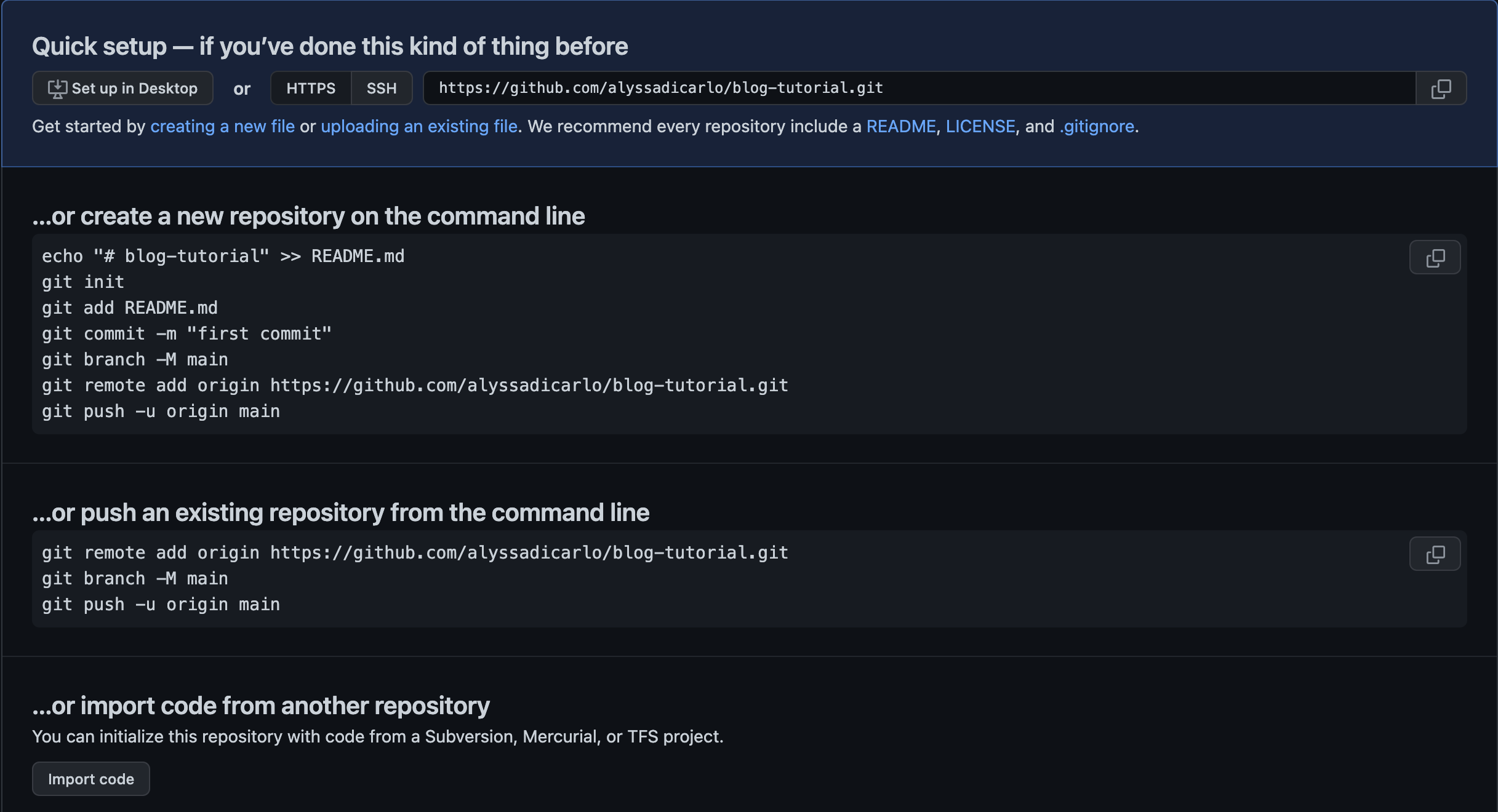 git remote add origin https://github.com/alyssadicarlo/blog-tutorial.git # add remote branch